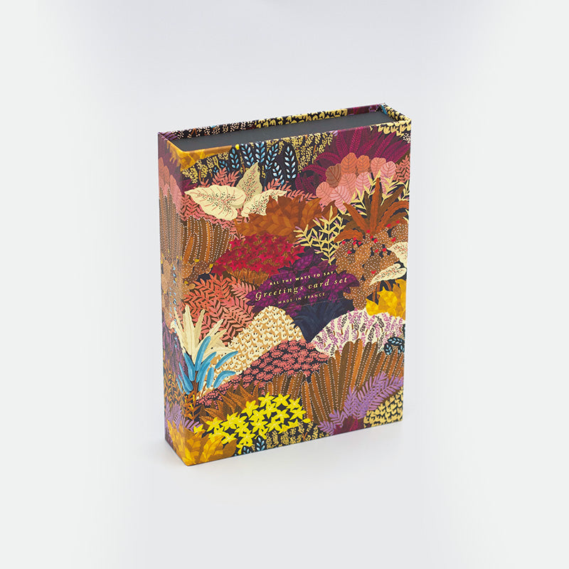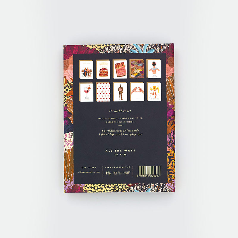 Set van 10 gevouwen A6 wenskaarten + 10 kraft enveloppen in een stevige kartonnen doos.Kaarten: Vrienden voor altijd, HPB F**k je bent oud, Vis in de zee, HPB Prairie, HPB Sexy, HPB slechts één drankje, F**k ik hou van je, Naked boy, Hands of love, HPB Let's go bananas .Bespaar 35% op de normale prijs(Hoogte: 175 mm x Breedte: 130 mm x Diepte: 35 mm)Naturel wit papier 320grLeeg interieurGedrukt in Frankrijk.