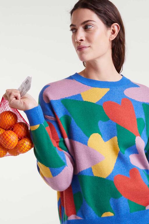 ProductbeschrijvingJacquardgebreide trui met cupido-print. Ronde hals en lange mouwen met licht verlaagde schouders. Geribbelde manchetten.