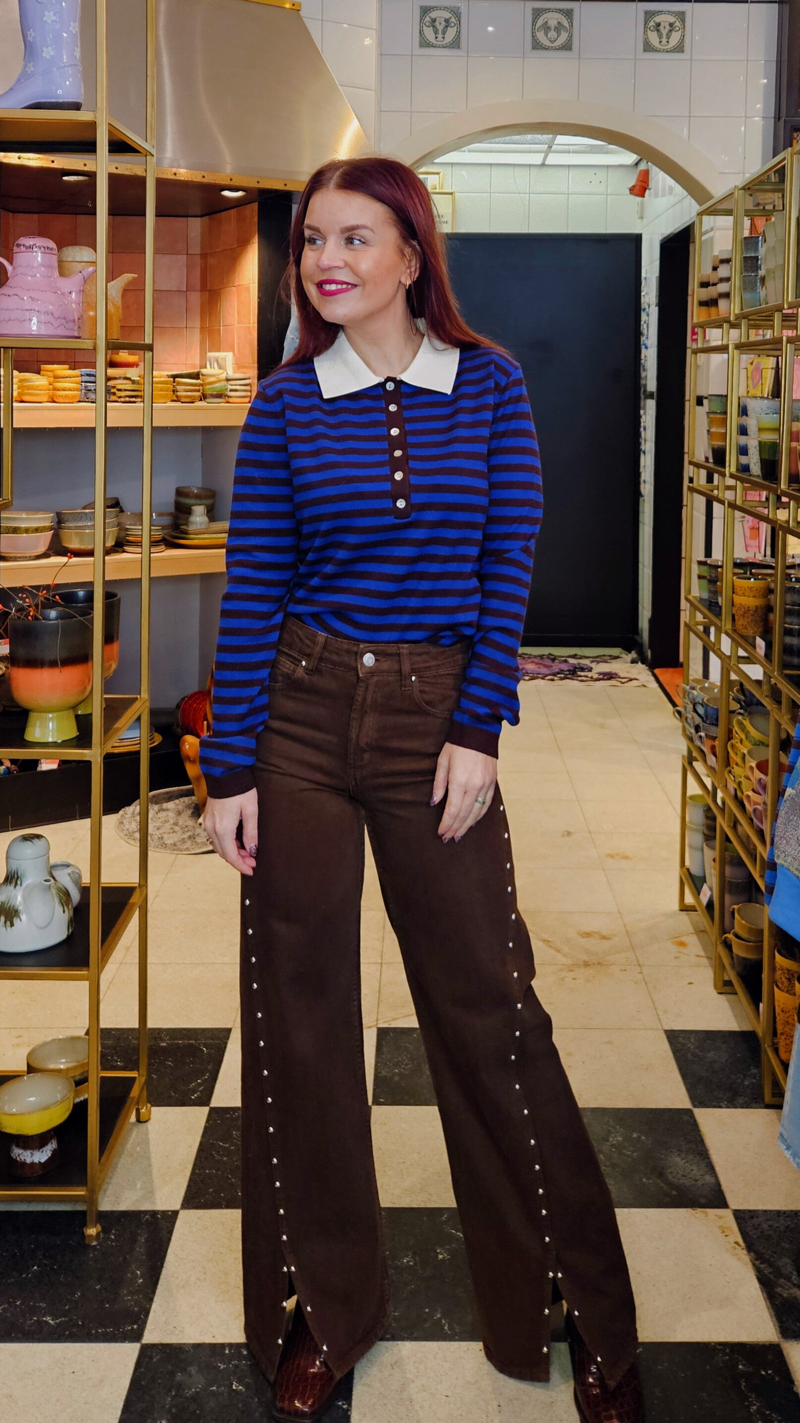 Maak kennis met Emke. Iets meer dan een gewone gestreepte trui. Met de kraag, knopen en casual pasvorm geeft het ons bij Bob & Bill french vibes. Productbeschrijving- lange mouw- all over streep dessin- breisel- kraag- knopen aan de voorkantMateriaal15% wol, 35% polyamide, 50% viscoseWil je meer weten over deze stoffen? Klik dan hier Stoffengids