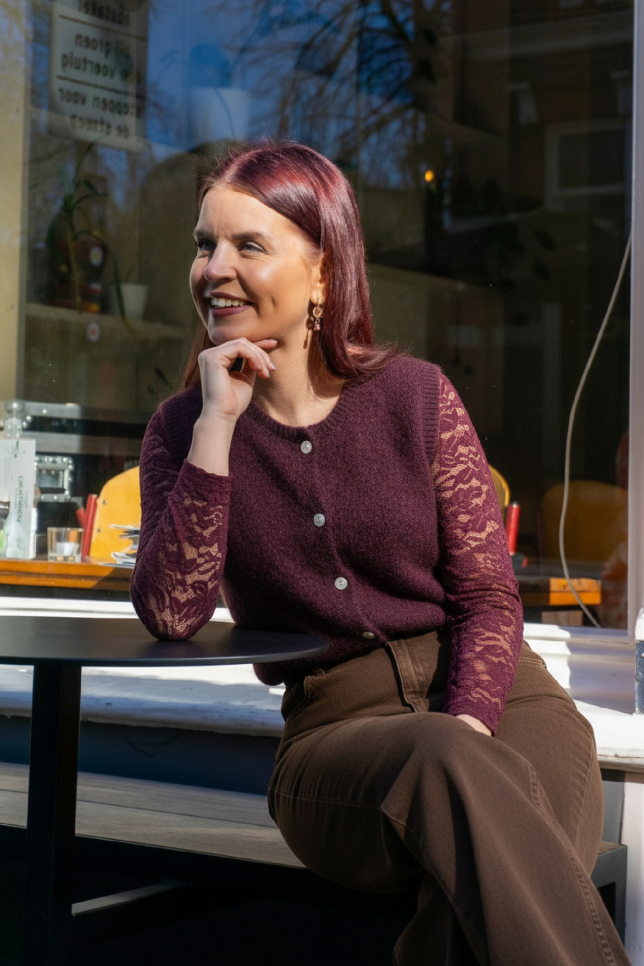 Deze mooie gilet mag niet ontbreken in je garderobe. Leuk met een blouse of mesh/kanten shirt eronder.Productbeschrijving- breisel- korte mouw- ronde hals- sluit dmv knopenMateriaal20% mohair, 10% wol, 26% polyamide en 44% acrylPasvormOne size. Xs t/m l