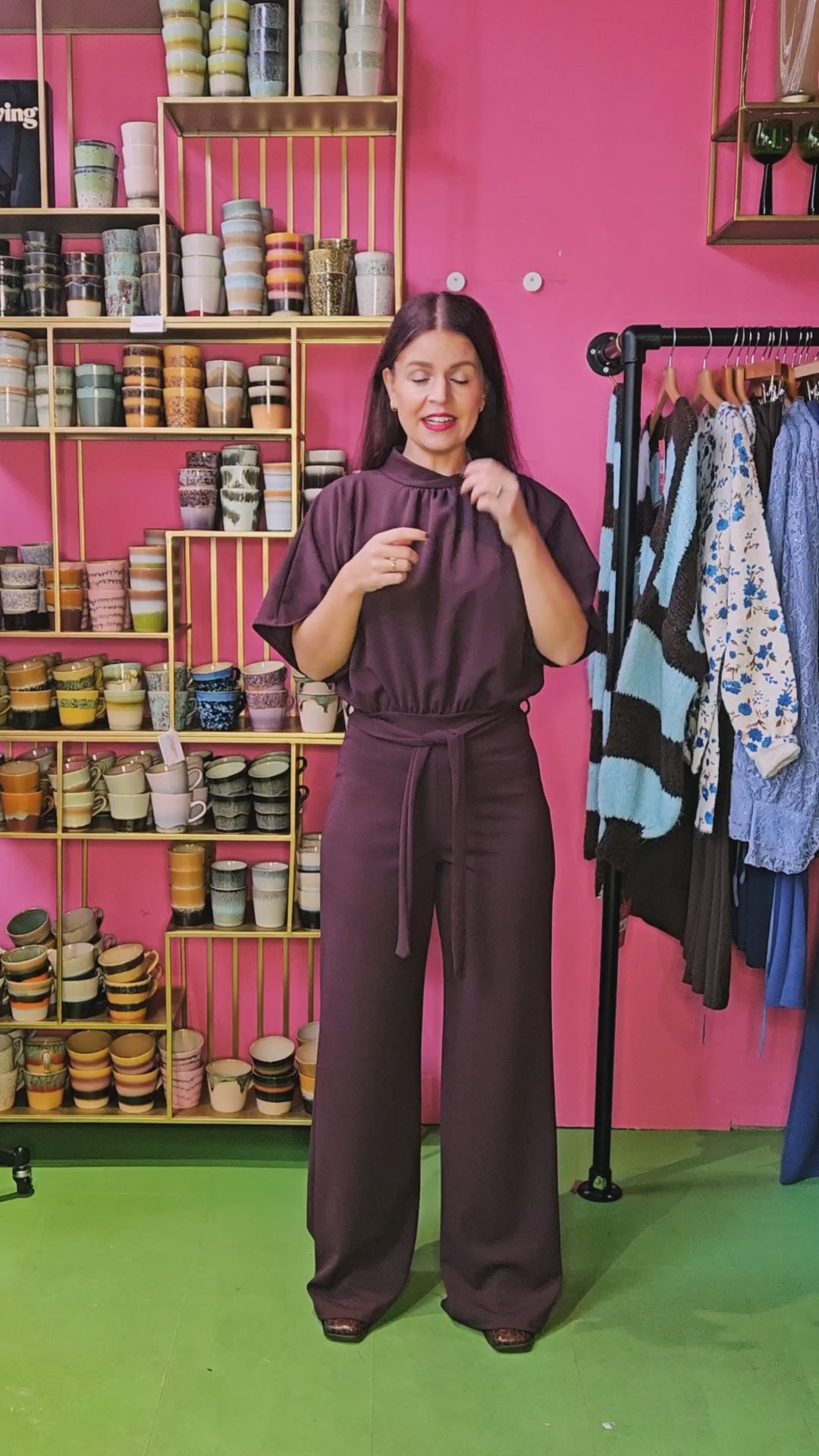 Een effen jumpsuit met een vrouwelijke pasvorm. De jumpsuit heeft een riem in de taille, luchtige mouwen en wijde pijpen. Het model draagt maat S.
