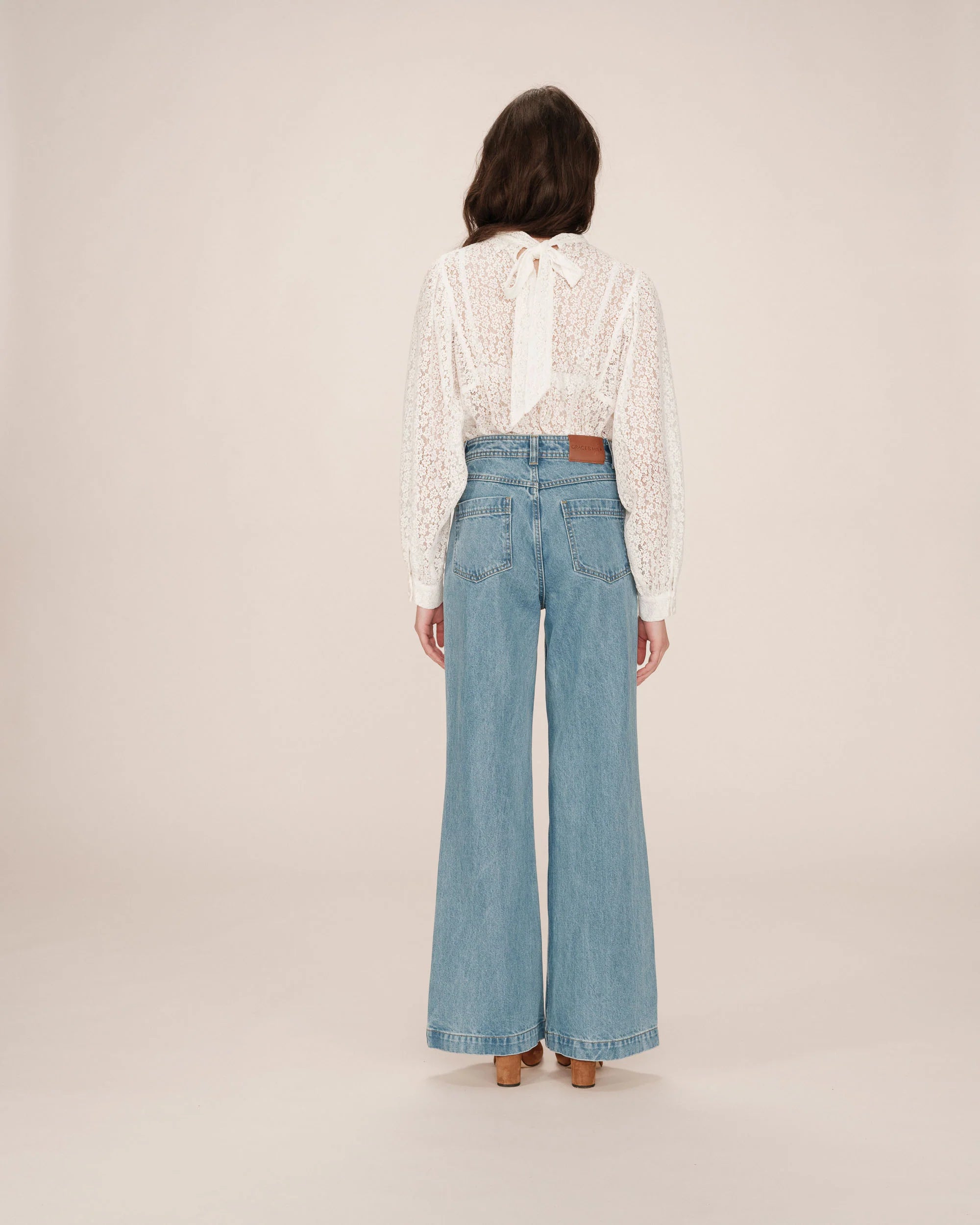 De hoge taille en uitlopende snit van de JACOB jeans creëren een strak en elegant silhouet. Het model is voorzien van riemlussen, een ritssluiting en een G&M-monogramknoop in de taille. De JACOB uitlopende jeans is versierd met een leren jacron op de achterkant. - Jeans- Slim fit, licht uitlopend aan de onderkant van de pijp- Hoge taille- Riemlussen- Ritssluiting met G&M monogramknoop in de taille- IJzeren plooien aan de voor- en achterkant- Opgestikte zakken aan de voor- en achterkant- Leren jacron op de achterkant