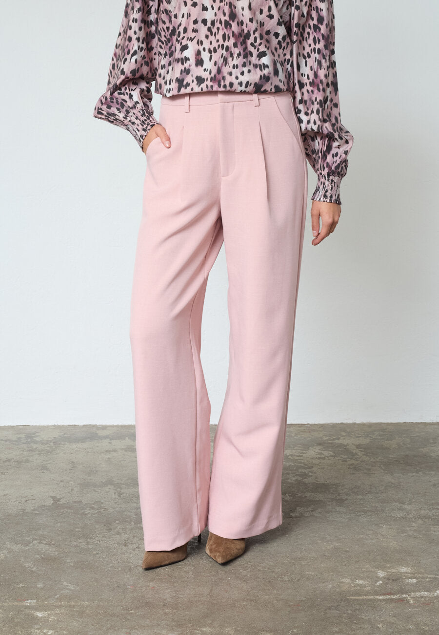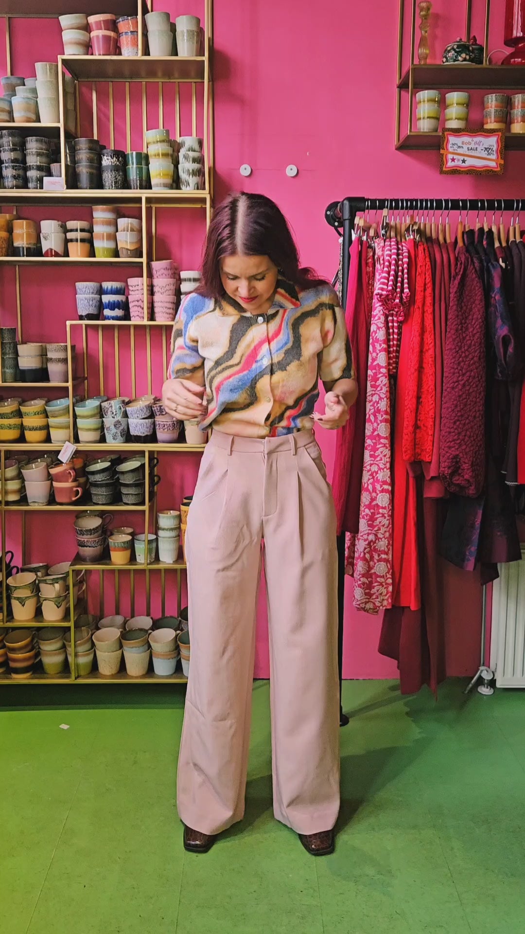 GREAT-PA3 is een losse broek met wijde pijpen en een strakke snit. De broek heeft een comfortabele pasvorm, plooien aan de voorkant en praktische zijzakken, perfect voor een elegante maar toch ontspannen look. Het model draagt maat S en is 171 cm lang.