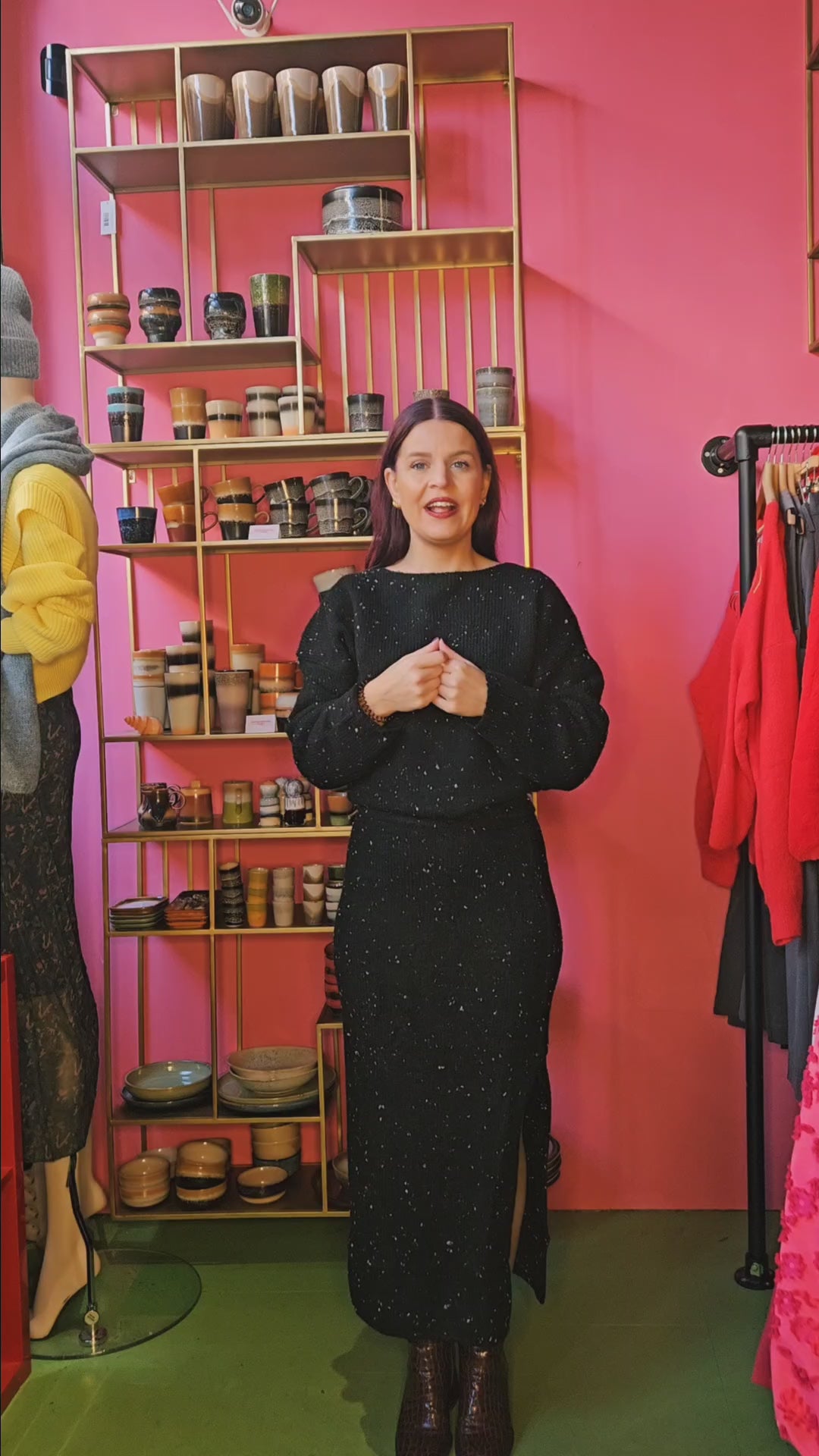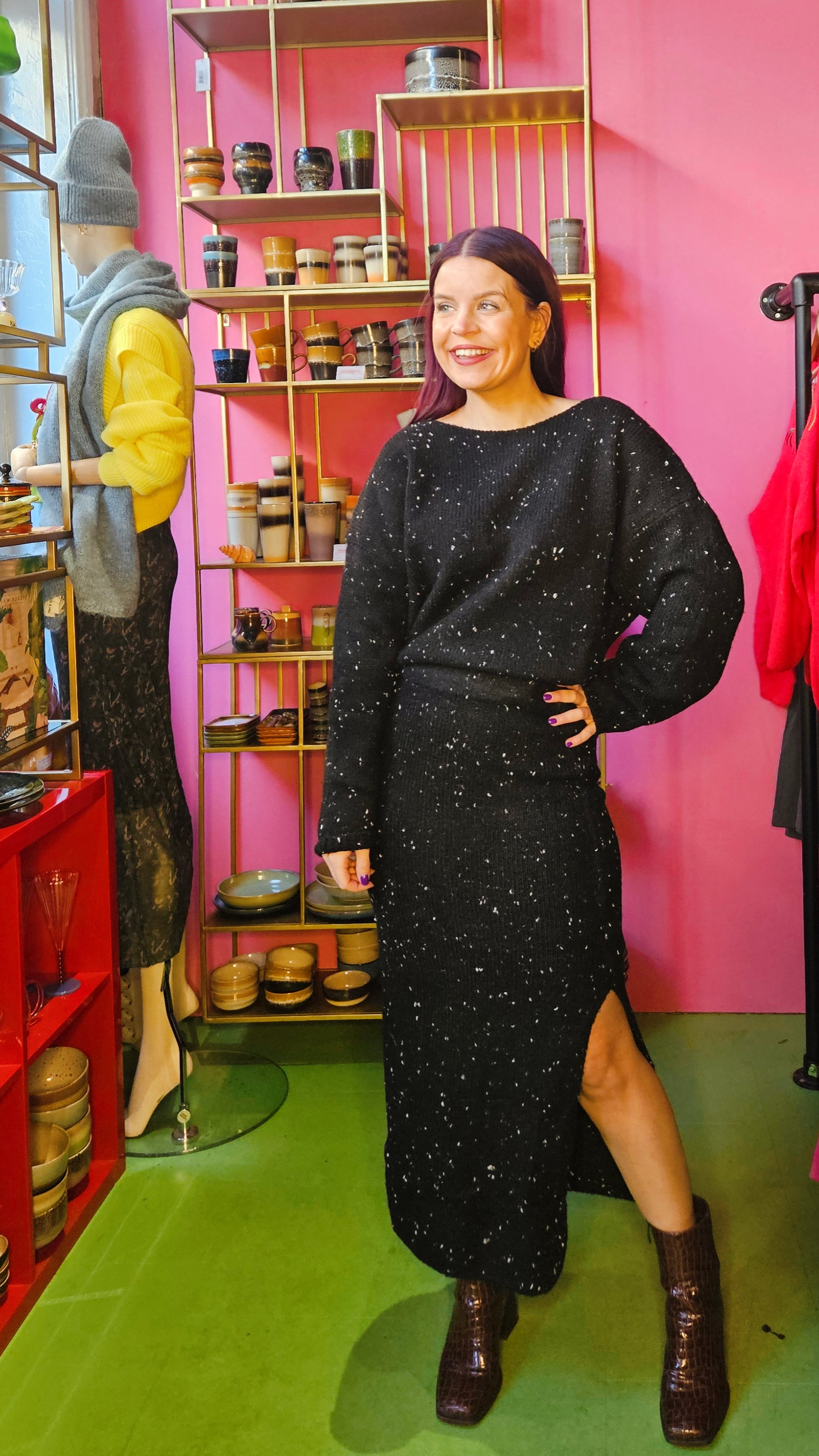 Wij houden van gebreide co-ord setjes. In 1 x klaar :)Productbeschrijving- ovale hals- spikkel geweven in de stof- breiselMateriaal