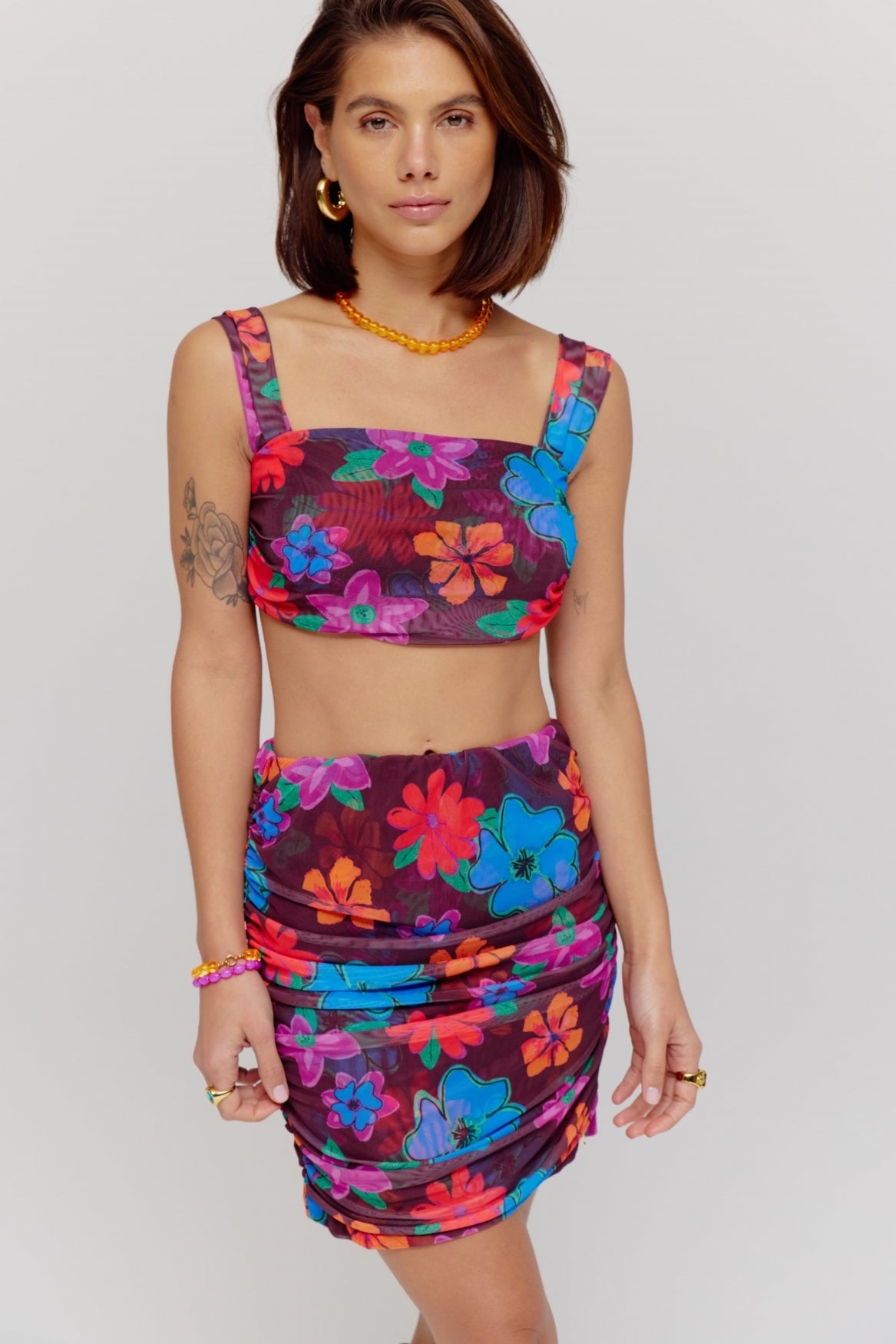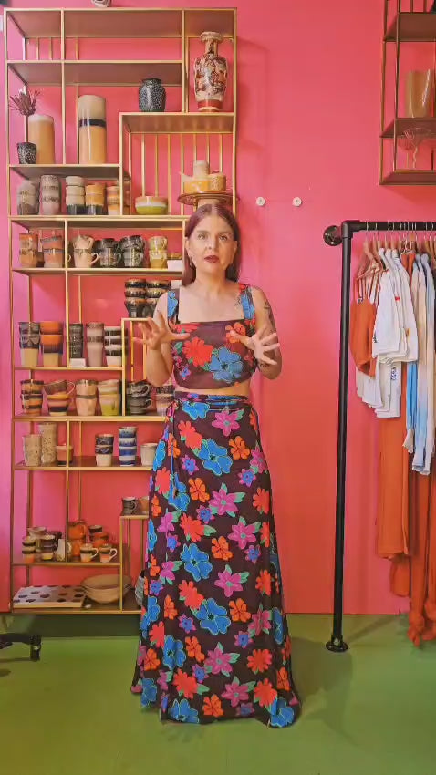 Make it pop with the BRANDY top in MYSTIC FLOWER. De BRANDY top is een echte eyecatcher door de flatterende pasvorm en MYSTIC FLOWER print. De brede bandjes zorgen voor een comfortabele fit, terwijl de mesh overlay met lichte plooien zorgt voor een speels en vrouwelijk effect. De top is gevoerd, zodat je 'm zorgeloos kunt dragen. Combineer ‘m met de BOWIE skirt voor een uitgesproken co-ord set, of kies voor de LEA skirt als je voor een luchtigere, zwierige look wilt gaan. Complete the look and bloom in bold colour.