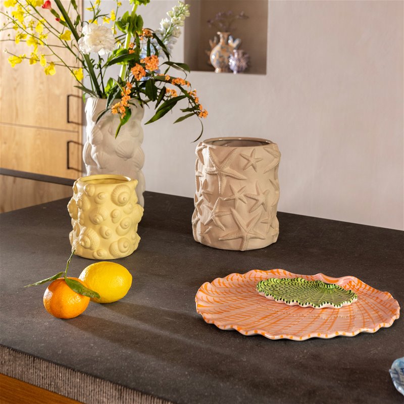 Materiaal: SteengoedKleur: GeelAfmeting: 14,5 x Ø 13,5 cmVerpakking: FSC, plasticvrijVerzorging en info: Afspoelen met lauw water voor reinigingProductinformatieDe Tide helix vaas heeft een organische uitstraling en een zomerse reliëfprint. Deze functionele vaas is perfect voor het schikken van een prachtig boeket of gewoon om te gebruiken als decoratief item.