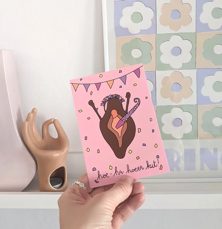 Opzoek naar een verjaardagskaart? Deze kut heeft in ieder geval zin in een feestje! Wist je dat Hoe-Ha een van de vele koosnaampjes is van onze kut?