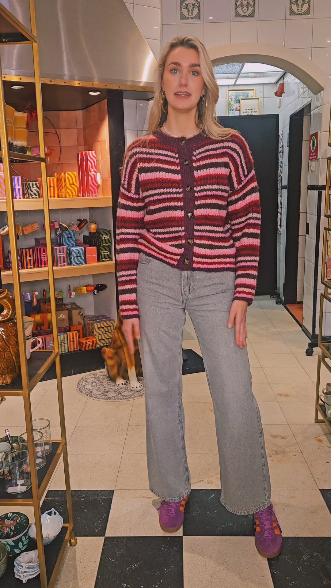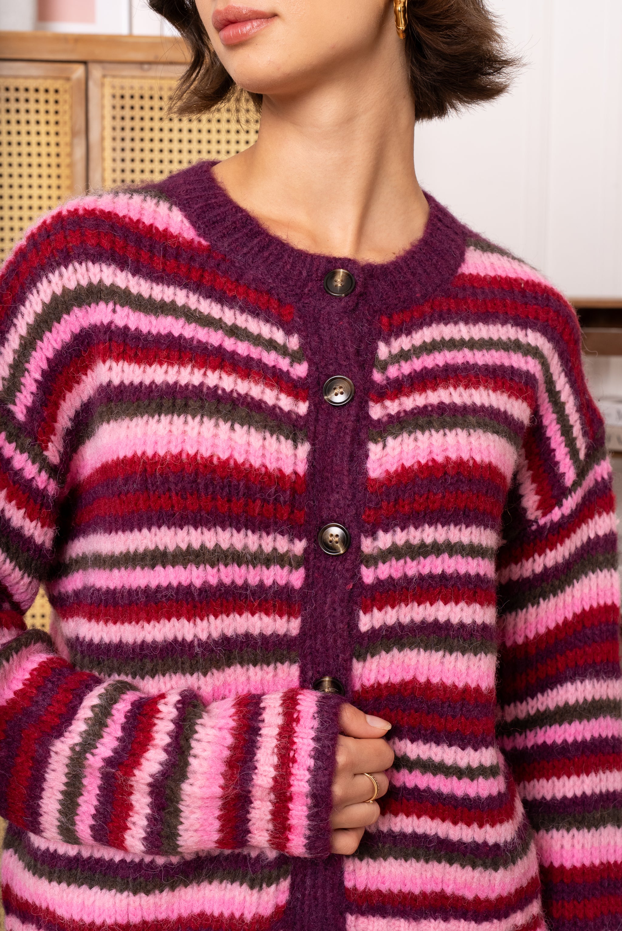 Dit toffe vest mag niet ontbreken in je garderobe. Streepjes zijn hot en de kleur bordeaux ook, dus 2 trends in 1!Productbeschrijving- lange mouw- streep dessin- ronde hals- sluit dmv knopenMateriaal/duurzame keuze8% wol, 22% polyester, 22% acryl. 48% polyamidePasvormvalt op maat.