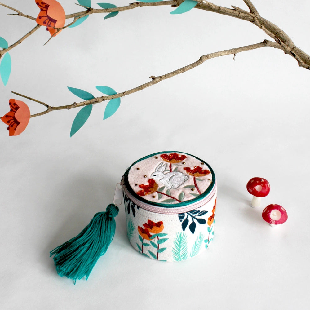 Materiaal: fluweel, katoenen voering en glaskralen Kenmerken: Een zacht juwelendoosje met een geborduurde fluwelen bovenkant met een konijn- en bladpatroon. Het is zorgvuldig versierd met delicate kralen, blauwgroene satijnen versieringen en een wollen kwastje. De behuizing van de doos is voorzien van een bijpassend gedrukt bladpatroon. Het is het perfecte reisaccessoire om je sieraden veilig te bewaren.