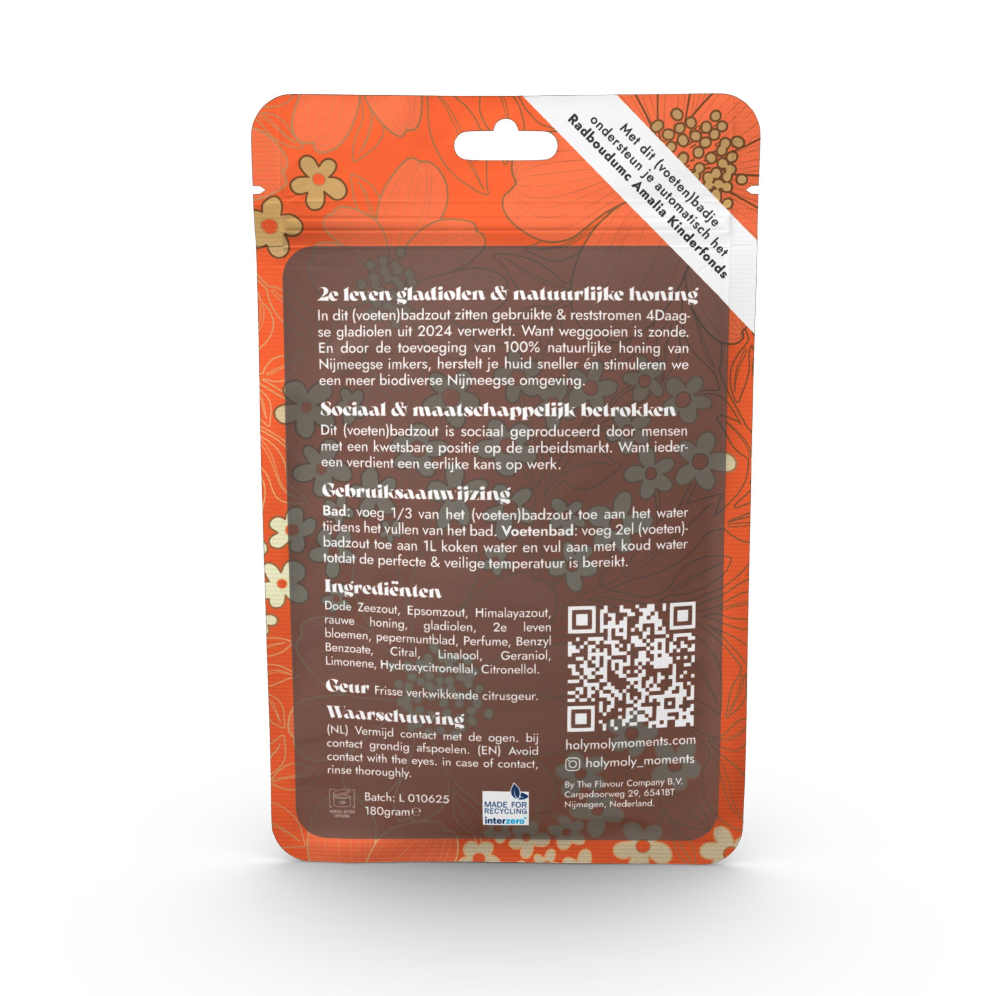 Dit (voeten)badzout bevat gedroogde gladiolen die we hebben ingezameld na de 4daagse editie van 2024. Want weggooien is zonde!
