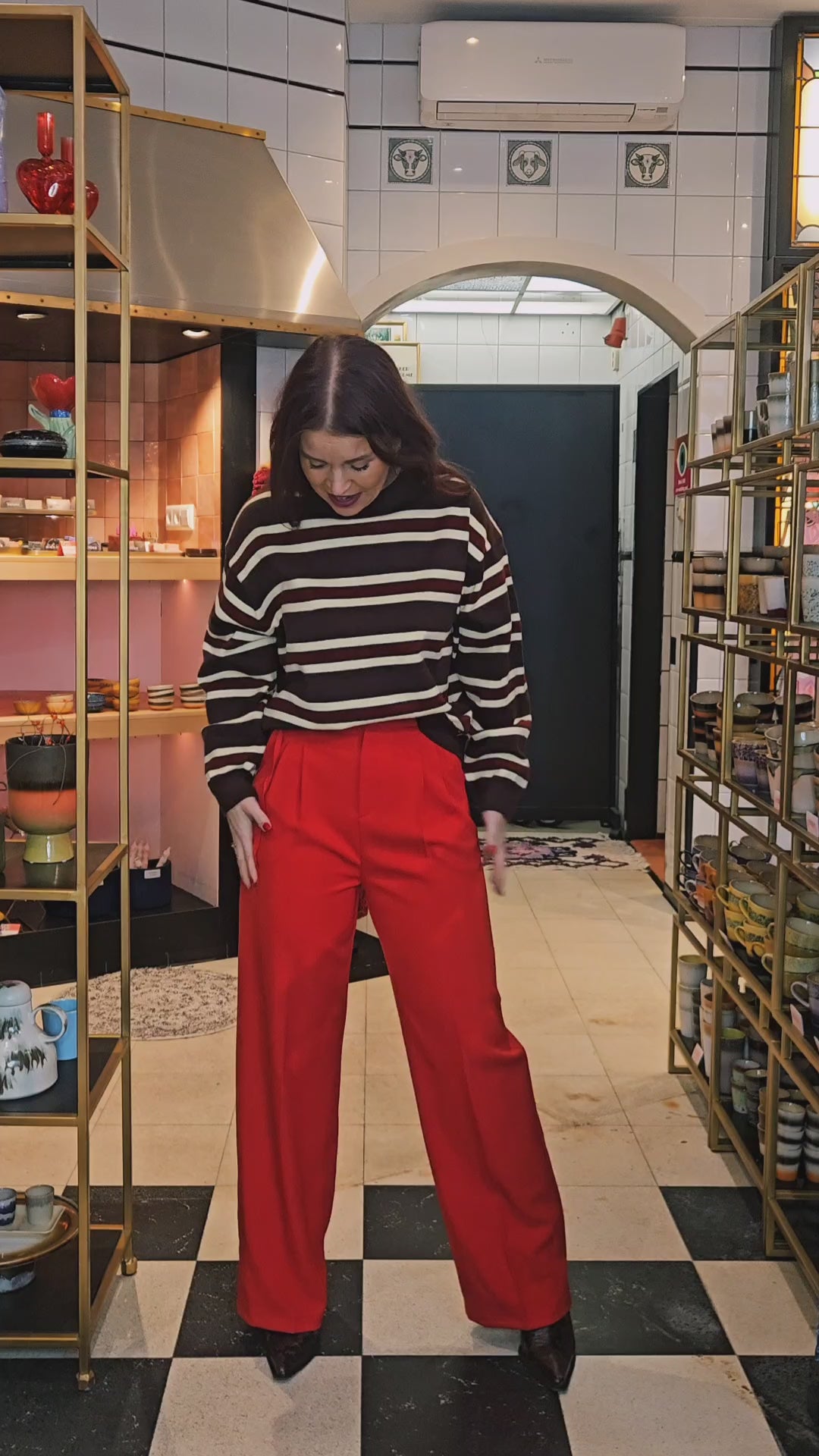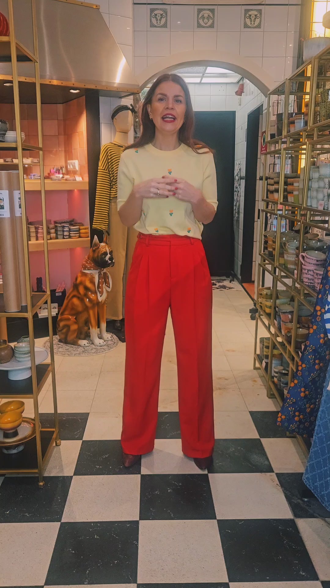 Een wijde pantalon met een hoge taille en plooien aan de voorkant. De pantalon heeft steekzakken en sluit met een knoopje en rits. De pijpen zijn recht.
